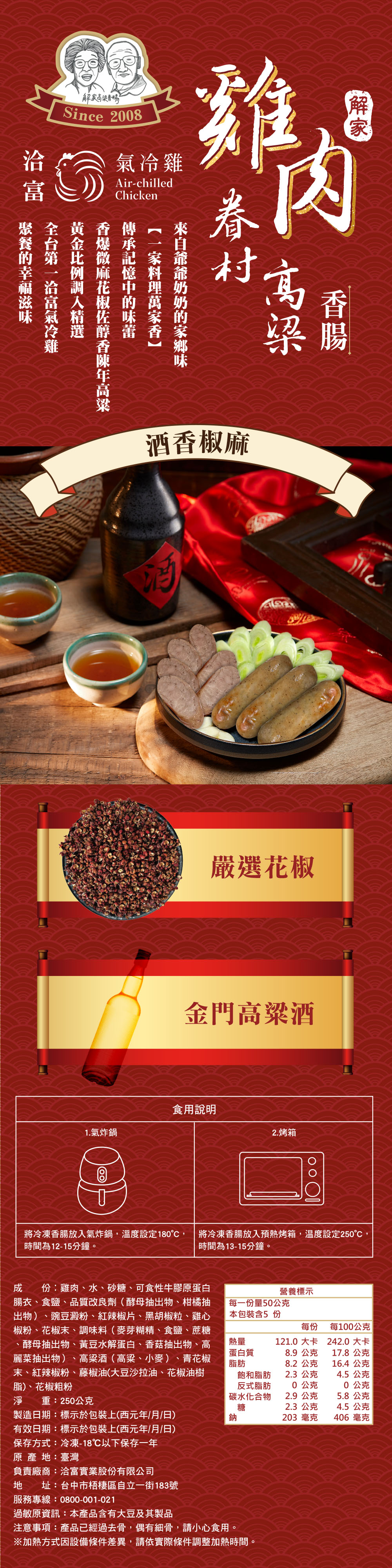 ● 產品名稱:解家X洽富酒香椒麻雞肉香腸250G/包